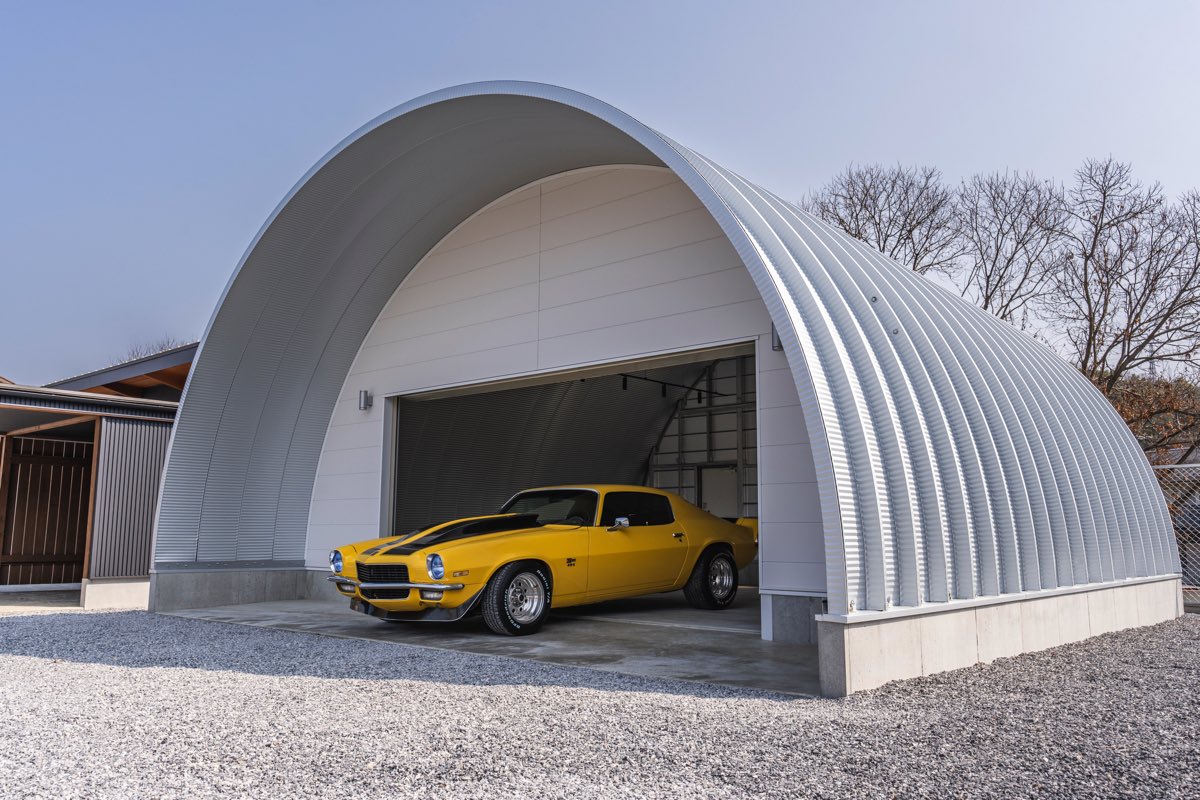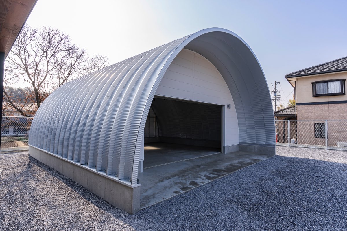 ガレージはもちろん、大型倉庫、整備工場など使い方は様々で、柱なしの大空間がつくることが可能です。 重量鉄骨に比べて工期や予算共に大幅に削減できます。